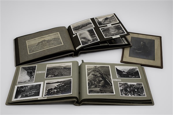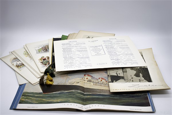Cartone contenente due album fotografici di viaggi e numerosi souvenir con menù di hotel e ristoranti di navi da crociera, principalmente della prima metà del secolo XX (difetti)