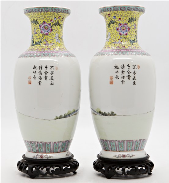 Coppia di vasi in porcellana policroma Famiglia Rosa raffiguranti figure femminili con bambini in un giardino poggianti su basi in legno