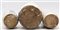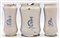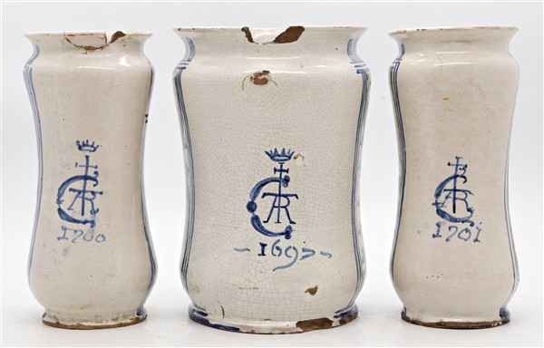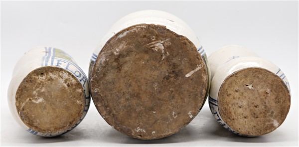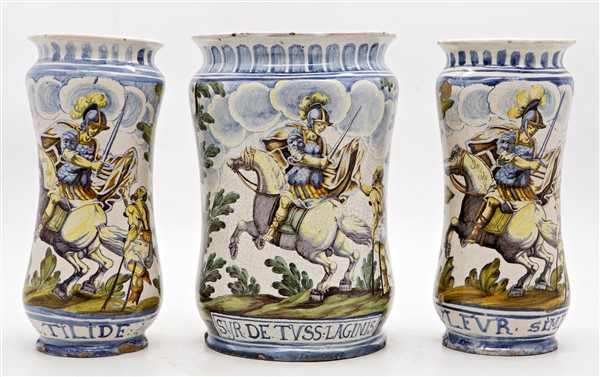 Manifattura dell'Italia meridionale, secolo XIX-XX. Lotto composto da coppia di albarelli e un albarello in maiolica dipinta in policromia con San Martino e iscrizioni del contenuto (h max cm 28) (difetti, mancanze e restauri)