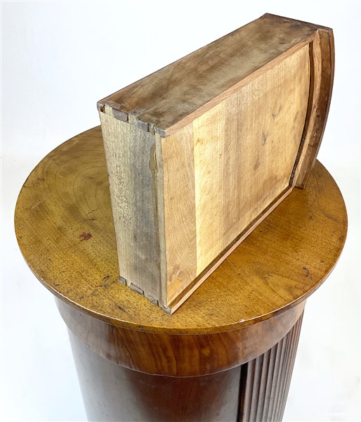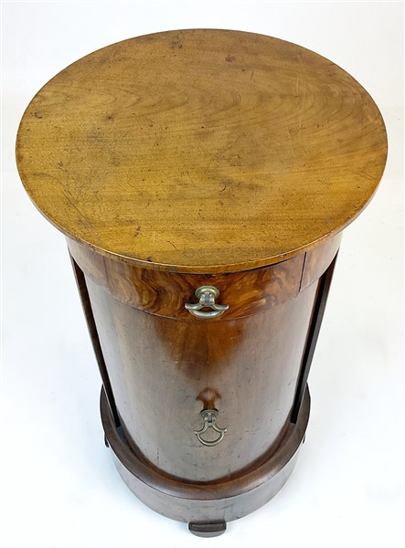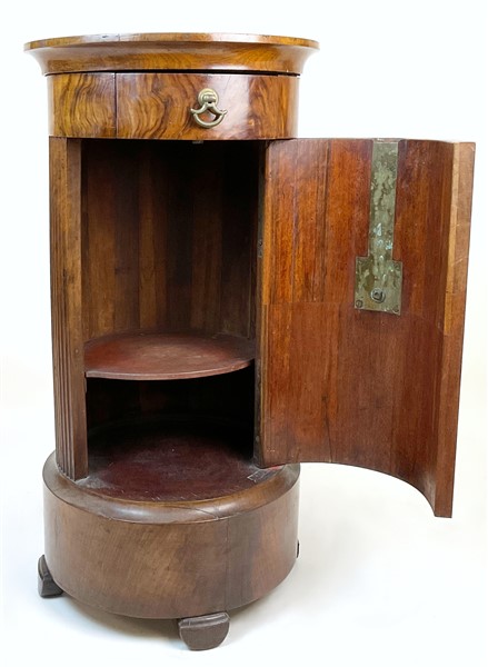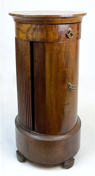 Comodino a colonna in legni vari ad un'anta e un cassetto sottopiano. Secolo XIX (d cm 44 h cm 86) (difetti)