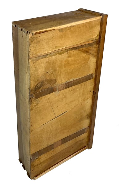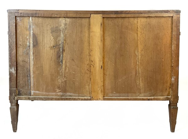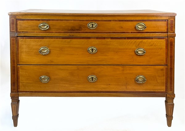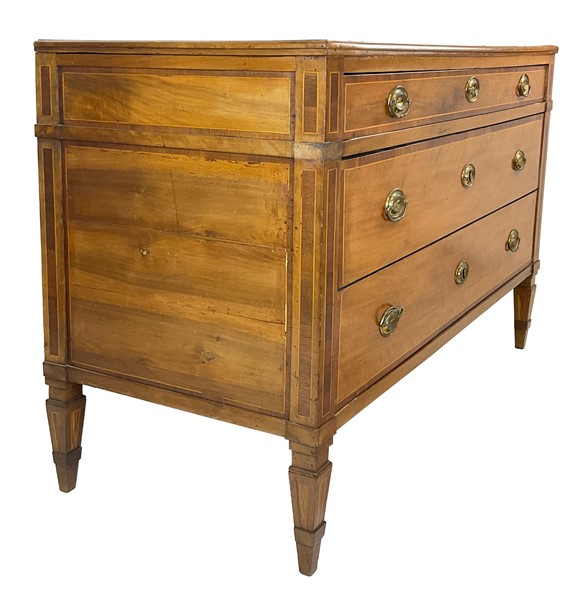 Cassettone lastronato e filettato in legni vari a due cassetti sul fronte ed un cassetto a mezza altezza sottopiano. Secolo XIX (cm 123x89x58) (difetti e rotture)