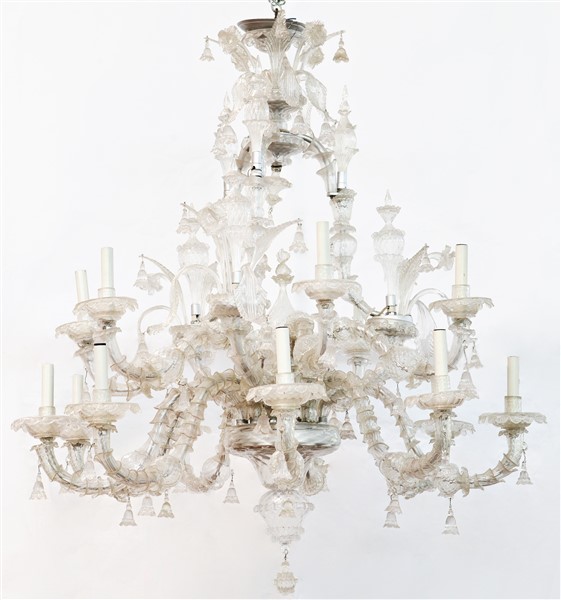 Manifattura di Murano. Grande lampadario a quindici luci in vetro incolore a doppio ordine, bracci a volute e pendenti a fiori (h cm 130, d cm 110) (difetti)