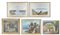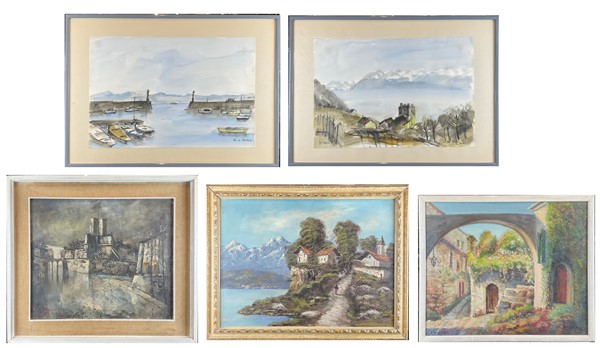 Lotto di cinque dipinti, ad olio e tecnica mista, raffiguranti paesaggi, autori