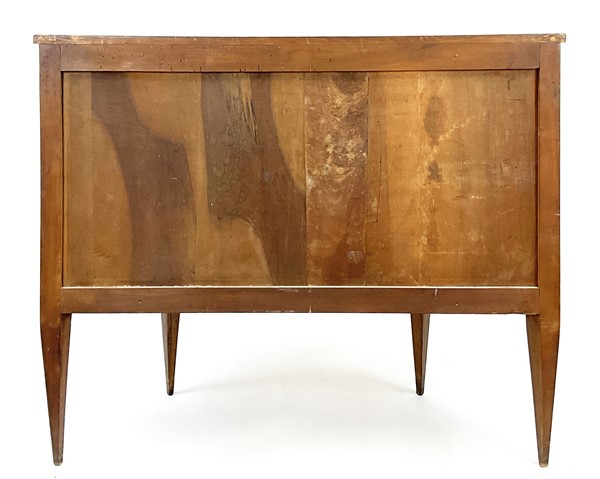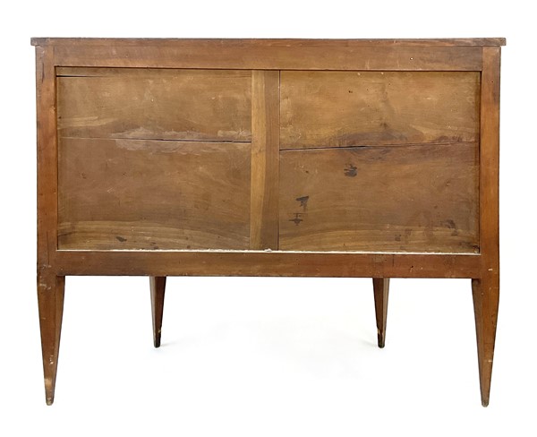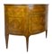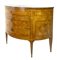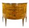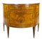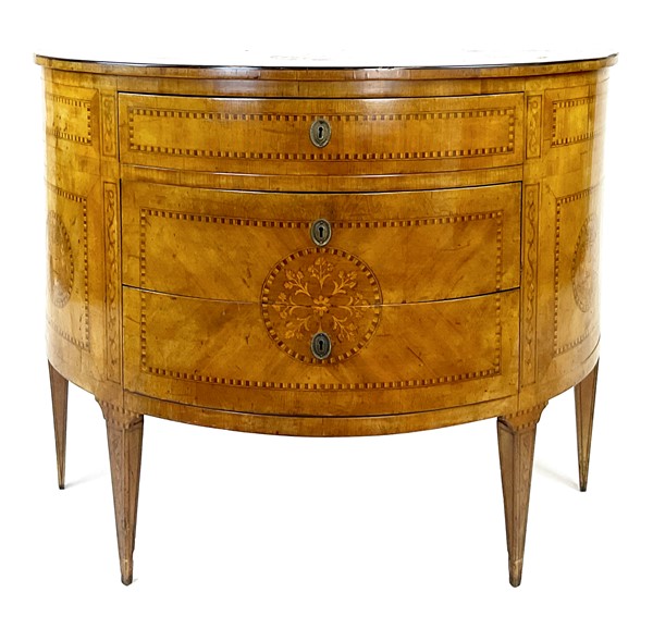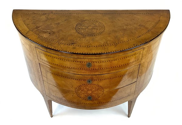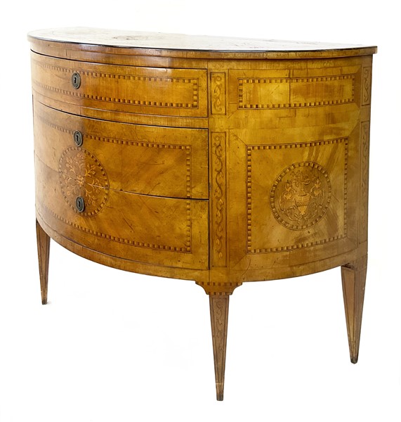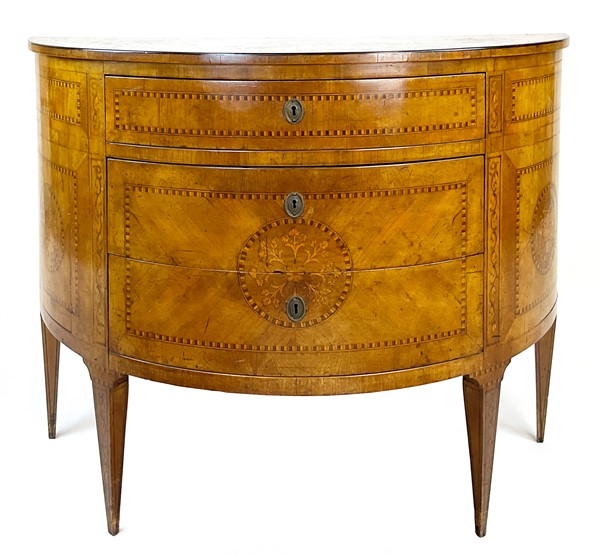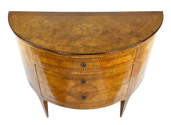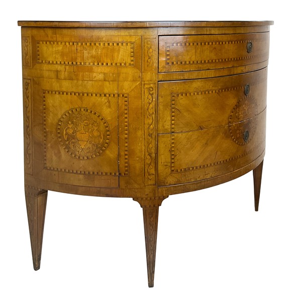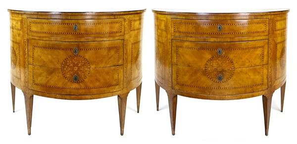 Coppia di cassettoni demi-lune lastronati in radica di noce e legni di varie essenze con tre cassetti sul fronte. Piano centrato da tondo intarsiato con vaso di fiori così come i fianchi ed il fronte. Piedi a obelisco rovesciato (cm 108x83x46) (difetti e restauri)