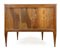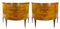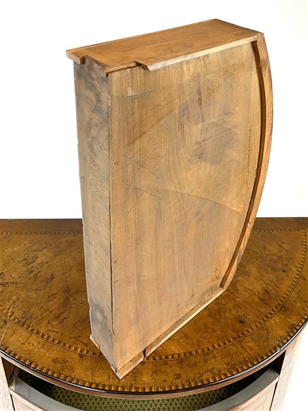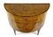 Coppia di cassettoni demi-lune lastronati in radica di noce e legni di varie es