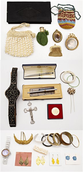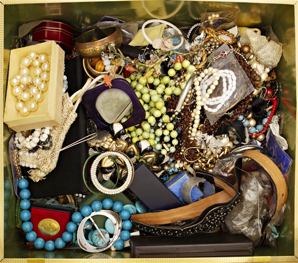 Grande scatola contenente bigiotteria di vario genere tra cui collane in pietra dura, perle fancy, orecchini, spilloni bracciali qualche orologio e due borsette (difetti e mancanze)