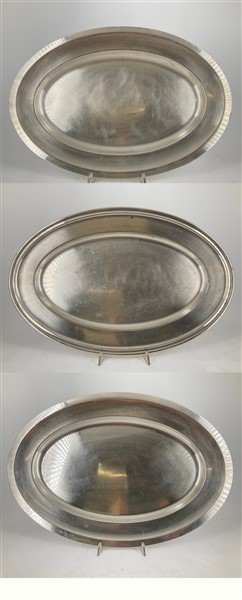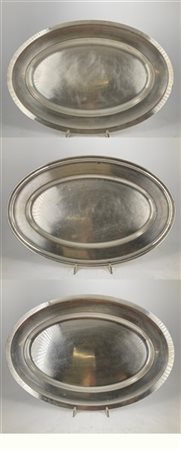 Lotto composto da due vassoi ovali in metallo argentato marcati Christofle ed uno simile marcato Boggi (l max cm 55) (difetti)