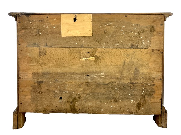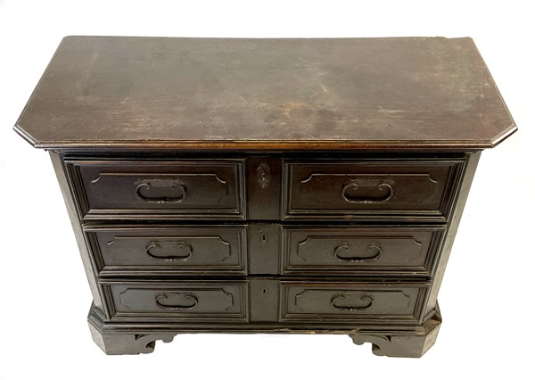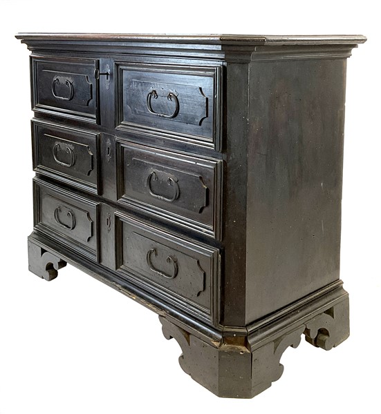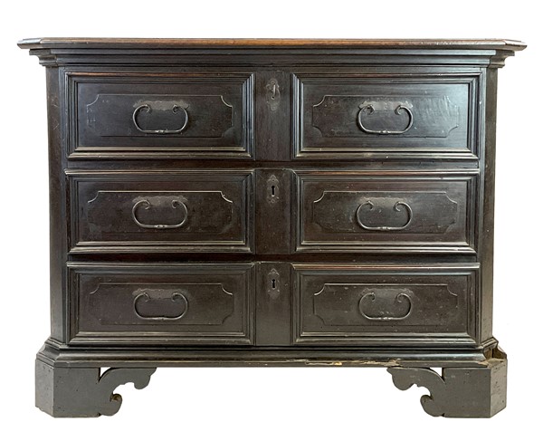 Cassettone in legno ebanizzato con fronte a tre cassetti decorati da riserve mistilinee a rilievo. Piedi a mensola. Secolo XVIII (cm 120x90x51) (difetti, restauri e mancanze)