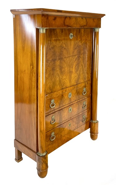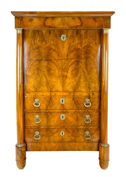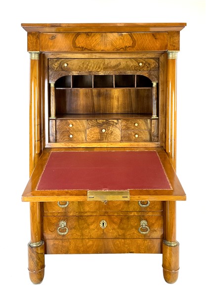 Secretaire in noce e radica di noce, fronte a quattro diversi cassetti e calatoia celante sei diversi tiretti e vani a giorno tra due colonnine, montanti a colonna. Secolo XIX (cm 95x150x44) (difetti)