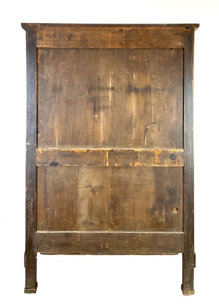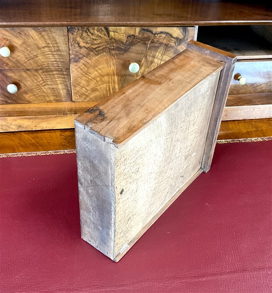Secretaire in noce e radica di noce, fronte a quattro diversi cassetti e calato
