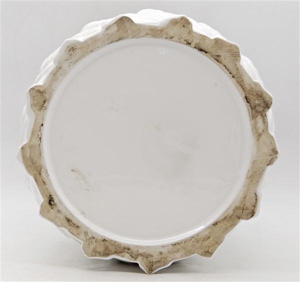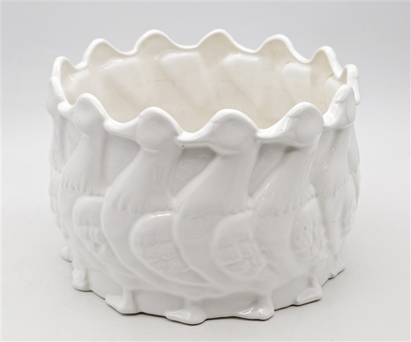 Lotto composto da due orci in terracotta ed un cache-pot in porcellana smaltata bianca decorata a papere in rilievo (h max cm 45 d max cm 30) (difetti)