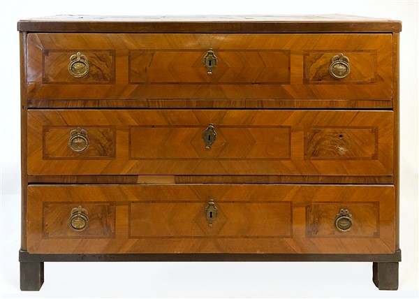 Cassettone lastronato e filettato in legni vari con tre cassetti sul fronte, piedi a plinto (cm 127x87x62) (difetti, restauri e sostituzioni)
