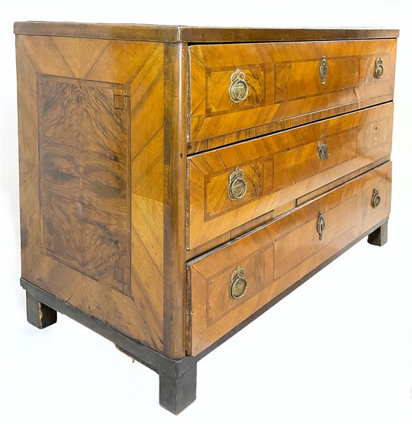 Cassettone lastronato e filettato in legni vari con tre cassetti sul fronte, pi