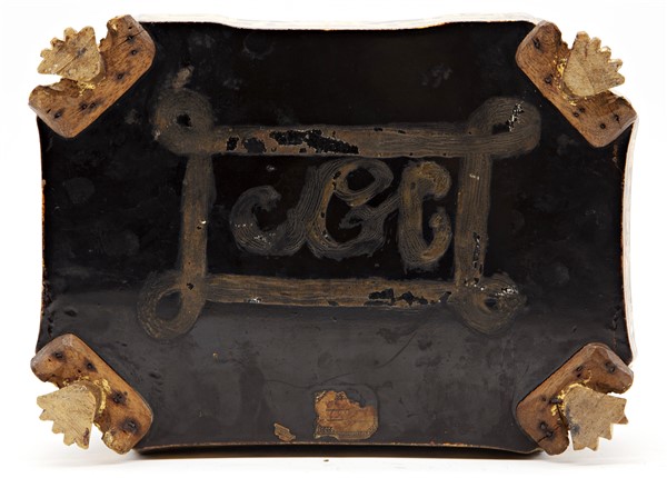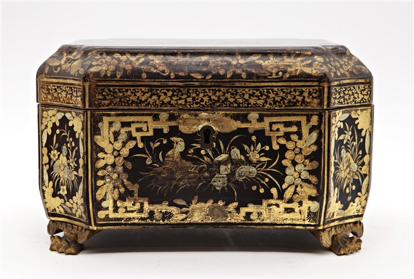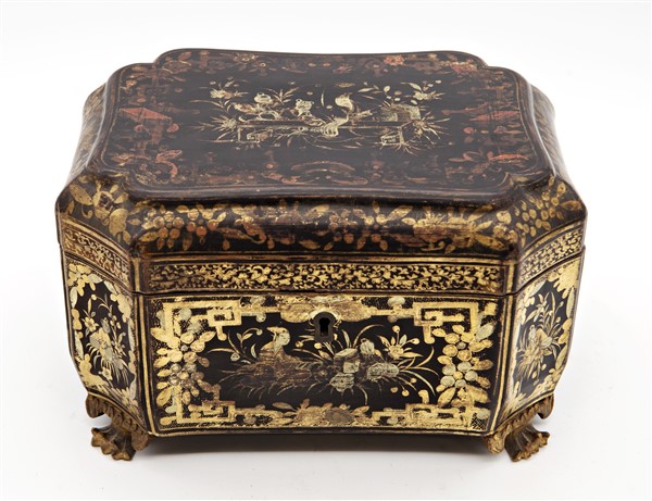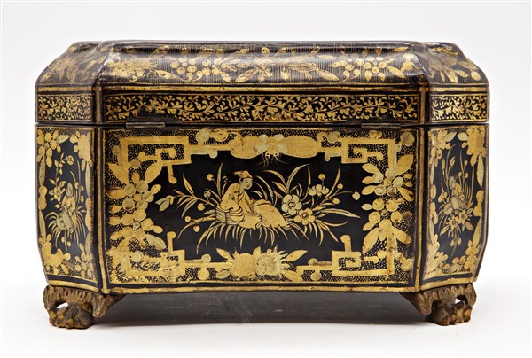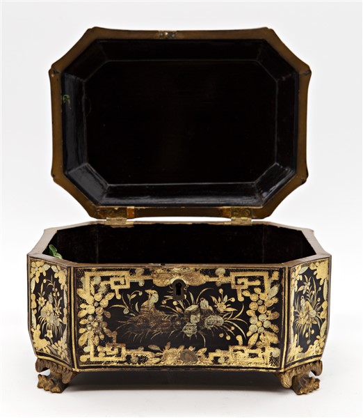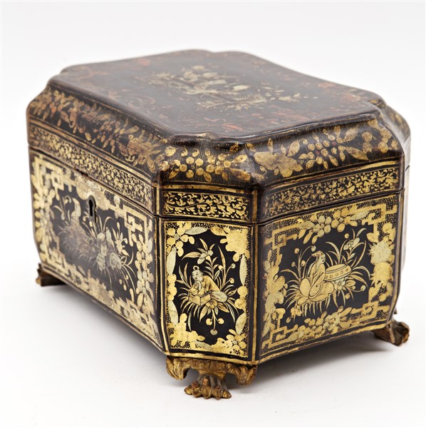 Cofanetto in legno laccato e decorato a figure orientali in oro su fondo nero con piedini intagliati. Secolo XIX (cm 25x15x17) (difetti)