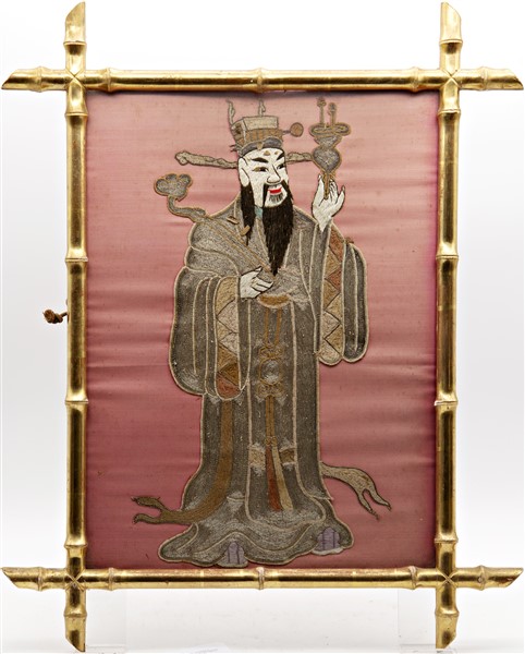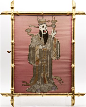 Arazzo raffigurante prete taoista in punto posato in seta e fili di metallo argentato. Cina, secolo XX (cm 47,5x35) in cornice dorata in finto bambù (cm tot 64x52) (lievi difetti)