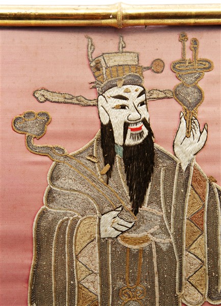 Arazzo raffigurante prete taoista in punto posato in seta e fili di metallo arg