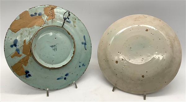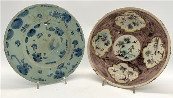 Manifattura di Savona, secolo XVIII. Lotto composto da un piatto decorato a paesini e figurette entro riserva su fondo manganese (d cm 23), ed un piatto in maiolica dipinta nei toni del blu a fiori e veliero (d cm 22,5) (difetti e restauri)
