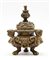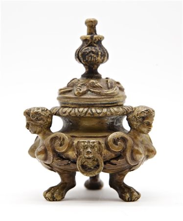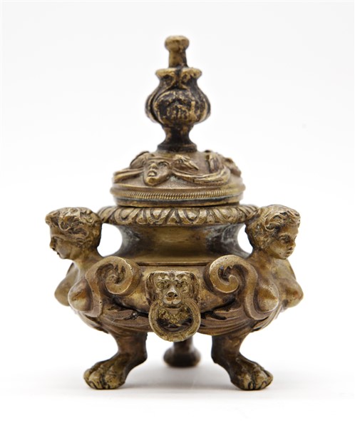Pandiani, Milano. Calamaio in bronzo con coperchio, sostegni a figure femminili alate monopodi. Marchio impresso sul fondo (h cm 10,5) (difetti)