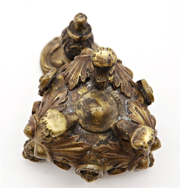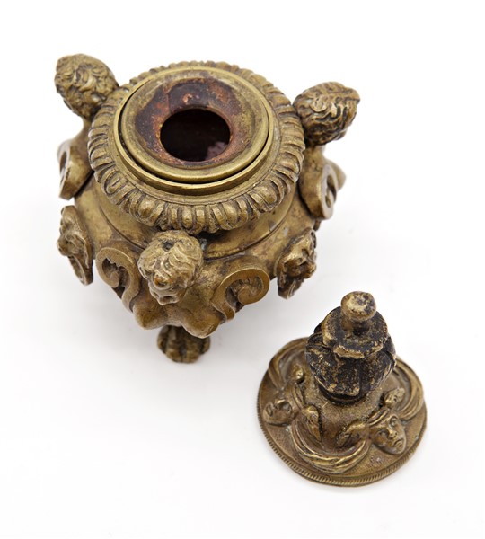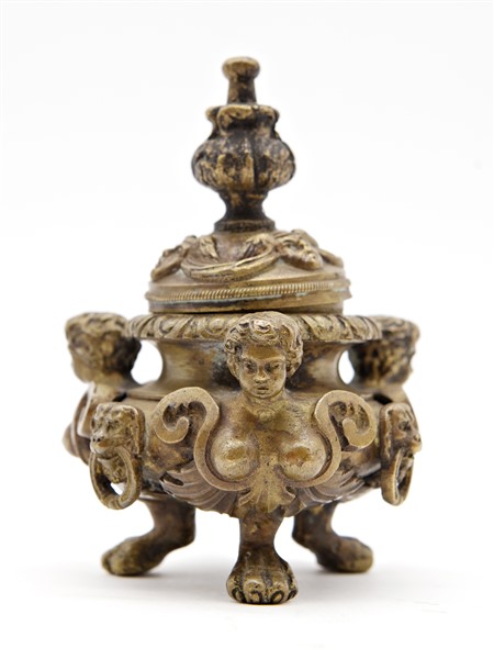Pandiani, Milano. Calamaio in bronzo con coperchio, sostegni a figure femminili