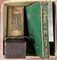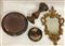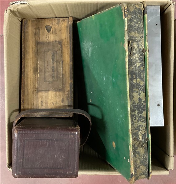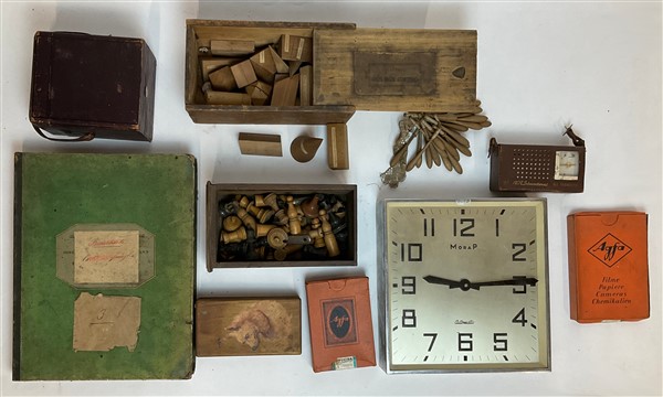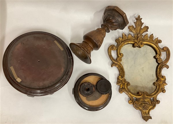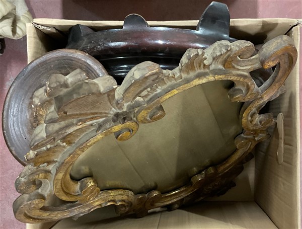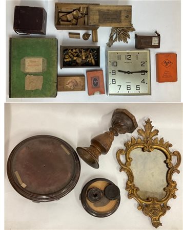Due cartoni contenenti numerosi oggetti per usi differenti, fra cui una scatola contente solidi per didattica in legno ed una specchiera con cornice in legno (difetti e mancanze)