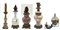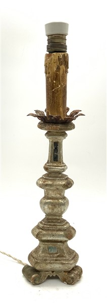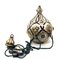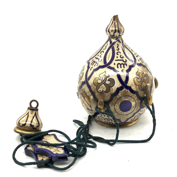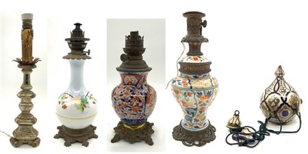 Lotto composto da tre diverse basi per lampada in porcellana con parti in metallo, una lampada a sospensione da moschea in ceramica e un candeliere in legno argentato adattato a lampada (h max cm 50) (difetti e mancanze)