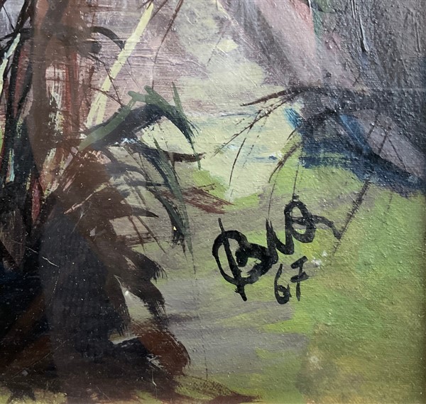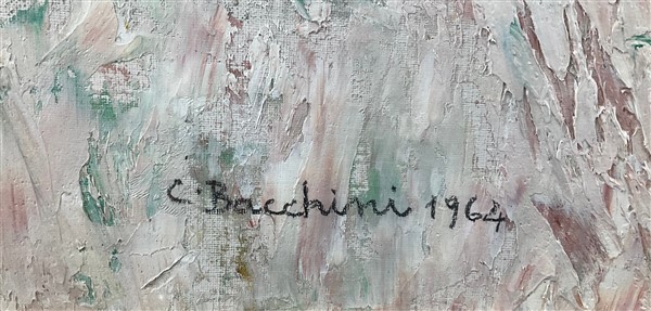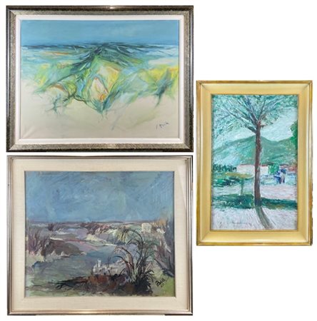 Lotto composto da due oli su tela raffiguranti paesaggi di Franco Bia, di misure diverse (misura max cm 60x80) e un olio su cartone telat di Carlo Bacchini, raffigurante albero in un paesaggio (cm 70x45) firmati al fronte e al retro