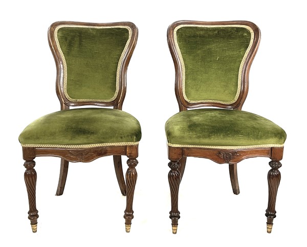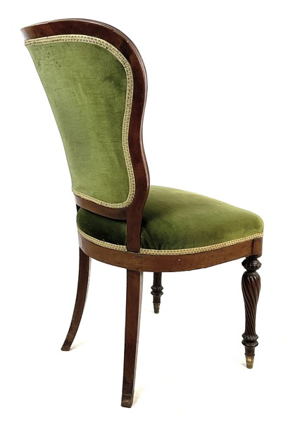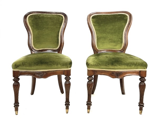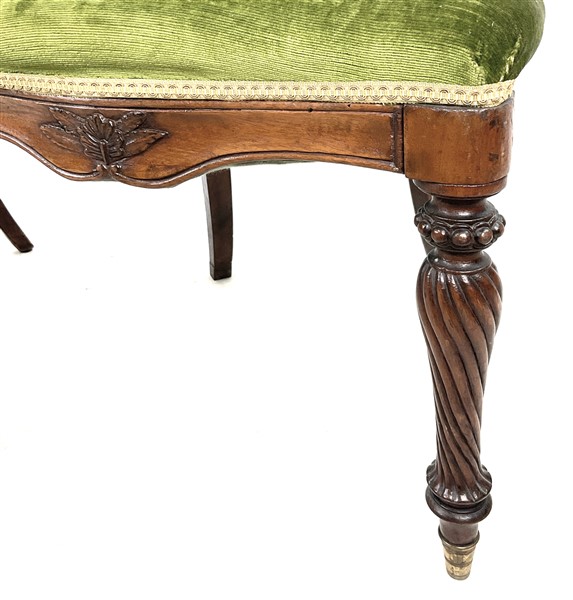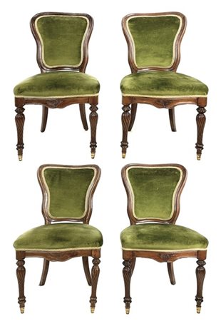 Gruppo di quattro sedie in mogano con gambe anteriore baccellate, seduta e schienale imbottiti (difetti)