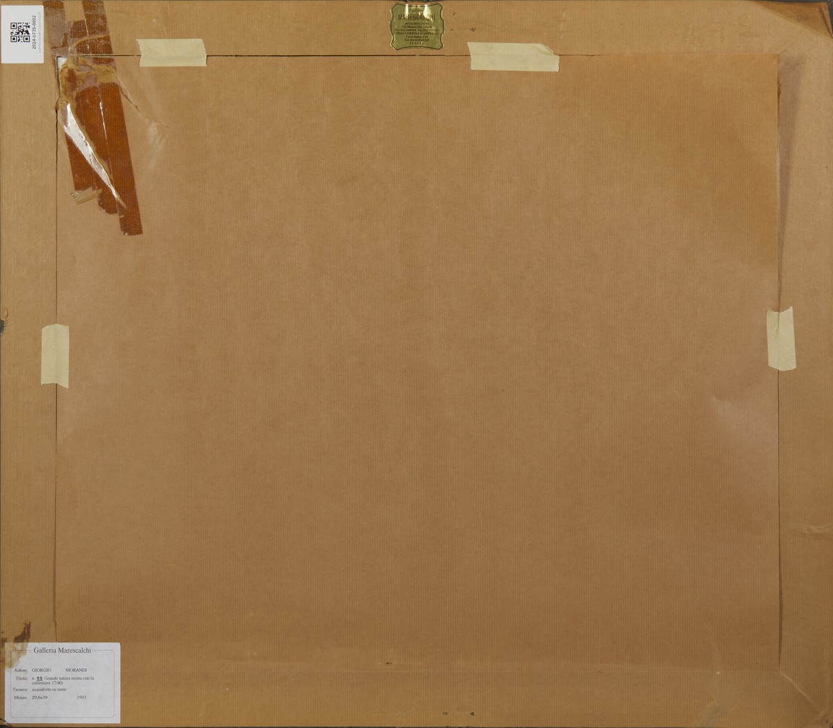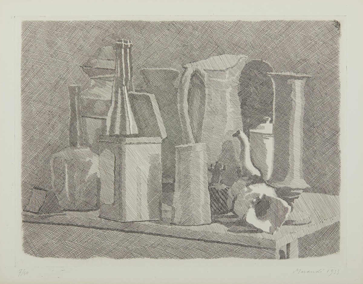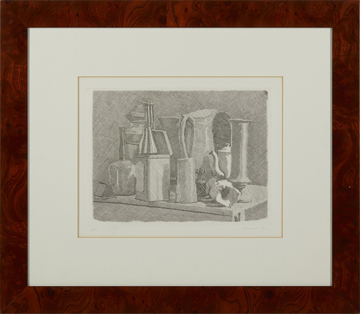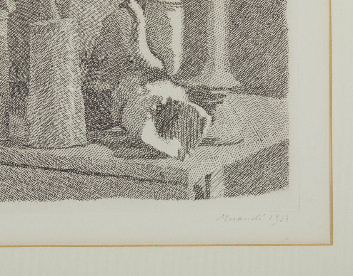 MORANDI GIORGIO (1890 - 1964) GRANDE NATURA MORTA CON CAFFETTIERA (II STATO), 1933. acquaforte su rame. Cm 51,50 x 39,00. firma, data e tiratura a matita; es. 7/40
