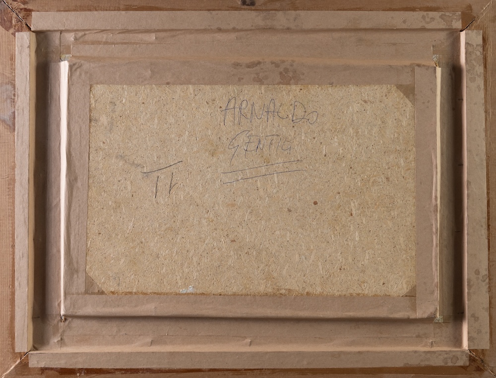 Arnaldo Gentili (Bologna 1890 - 1988). Colline primaverili. Olio su faesite. Firmato e datato in basso a destra A. Gentili 61. Cm. 47x32. In cornice cm. 66x51.