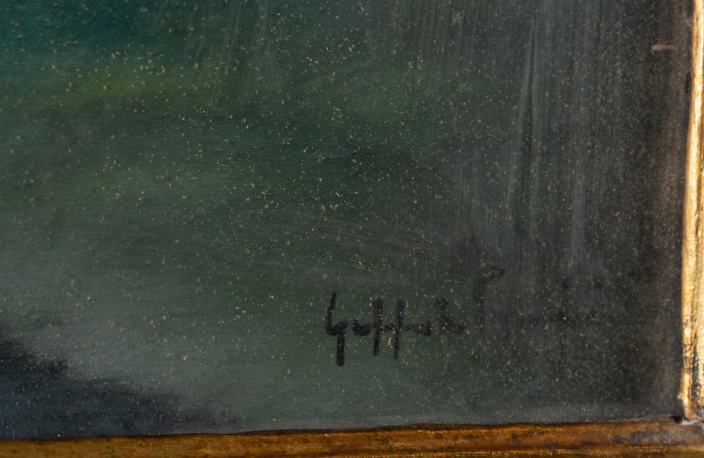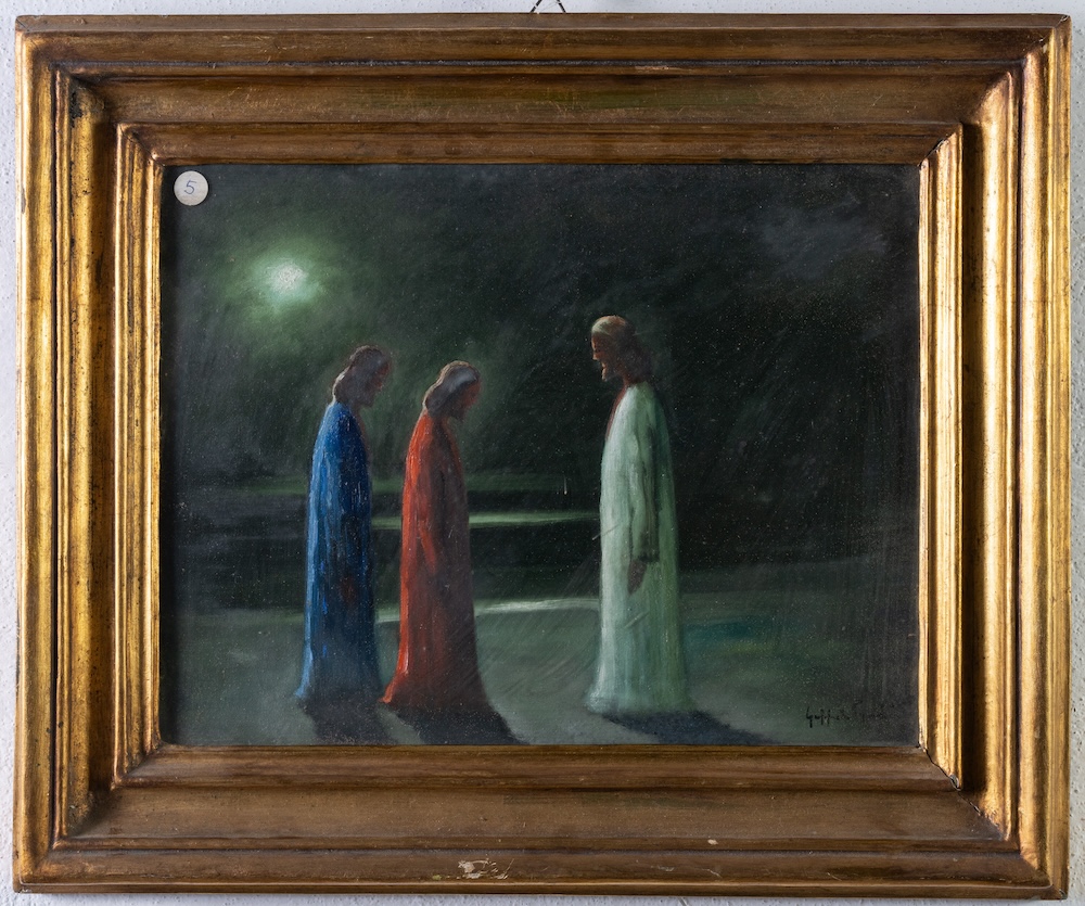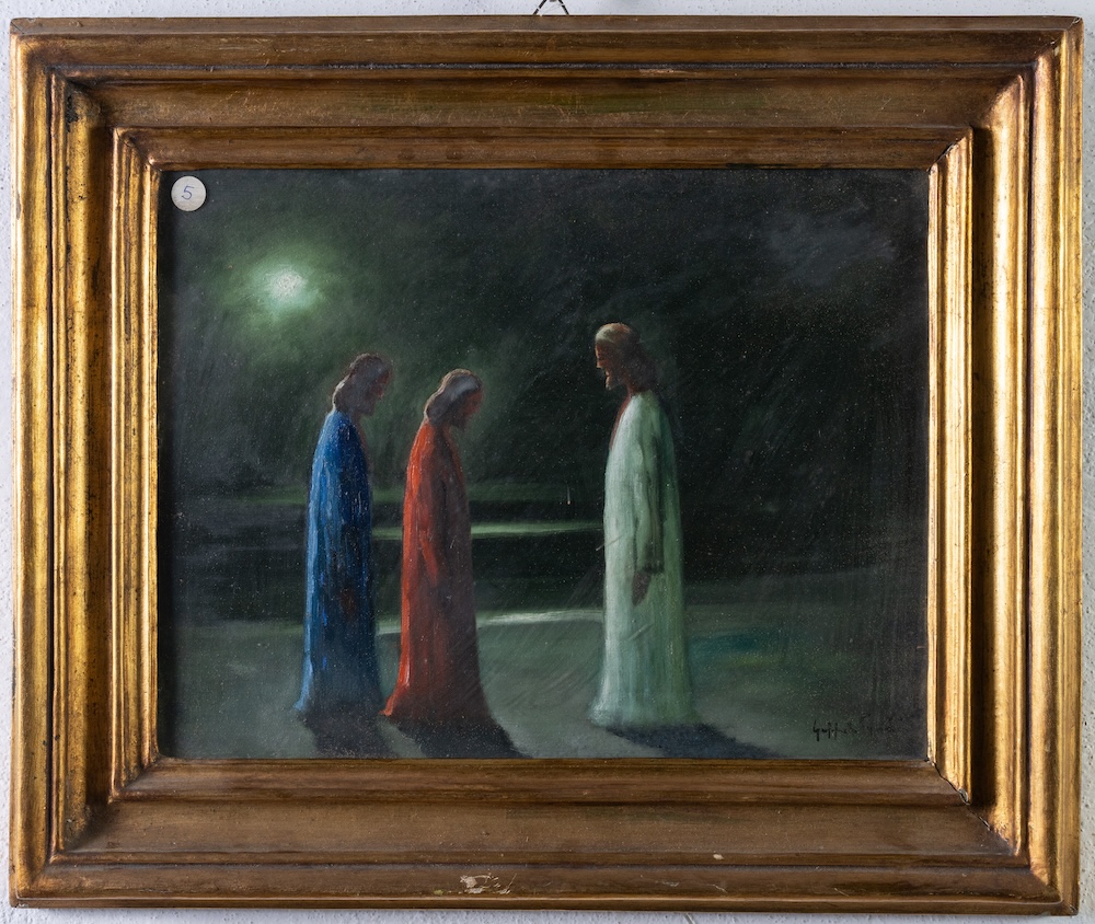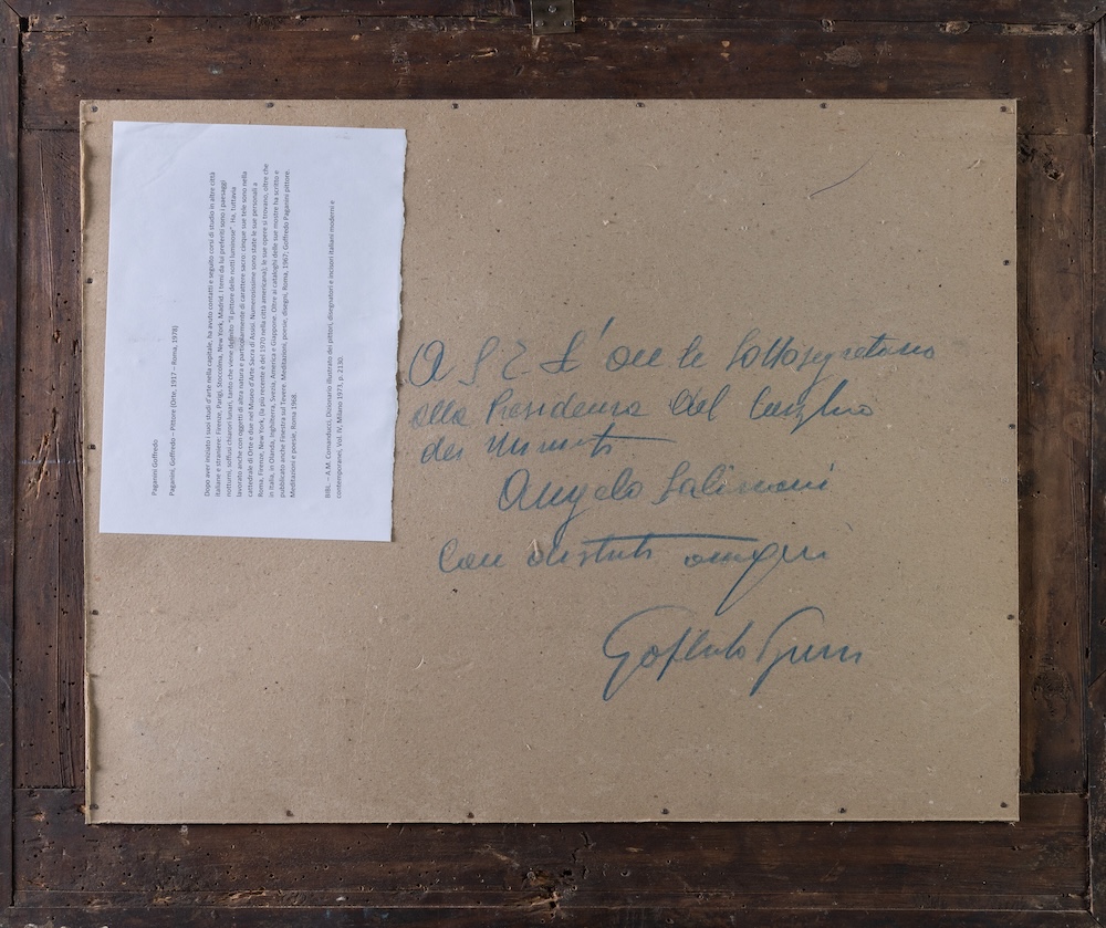 Goffredo Paganini (Orte 1917 - Roma 1978). Senza titolo. Olio su cartone. Firmato in basso a destra. Al verso presente dedica ed estratto biografico. Cm. 36,5x47,5. In cornice cm. 48,5x58,5.
