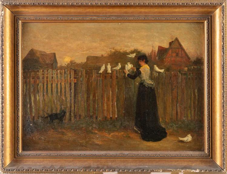 Pittore inglese del XIX secolo. Figura femminile con colombe ad una staccionata.