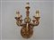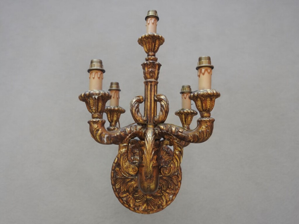 Grande braccio a cinque luci in legno intagliato e dorato, modellati a tralci vegetali