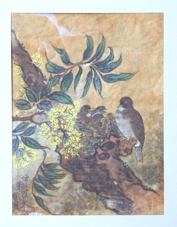 Dipinto cinese raffigurante uccellini tra rami in fiore e iscrizione