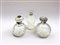 Tre bottiglie da profumo in cristallo intagliato con tappi in argento, una con micromosaico raffigurante il Pantheon