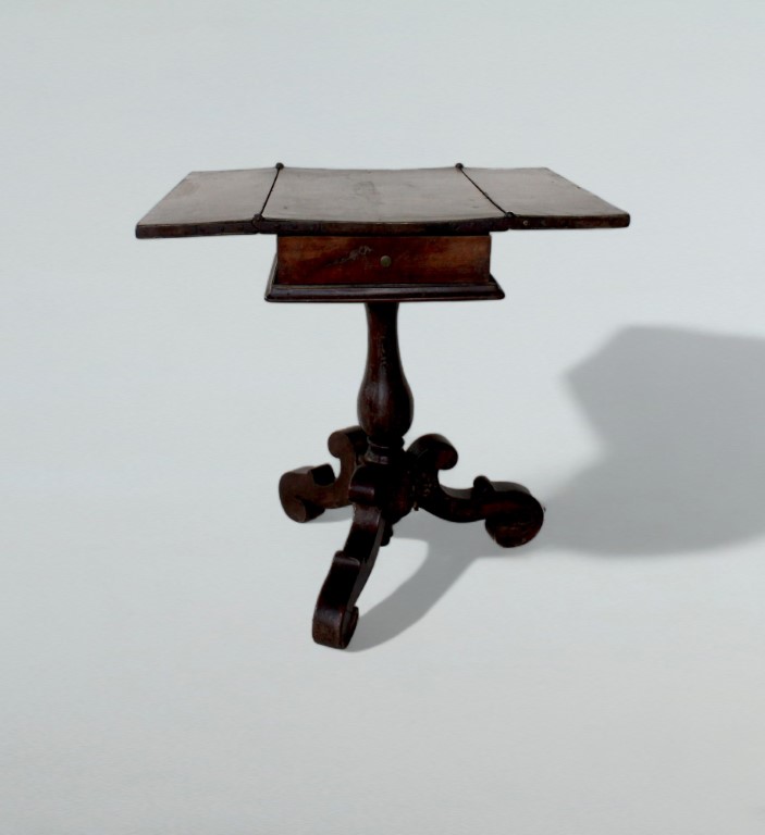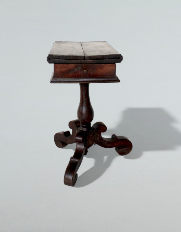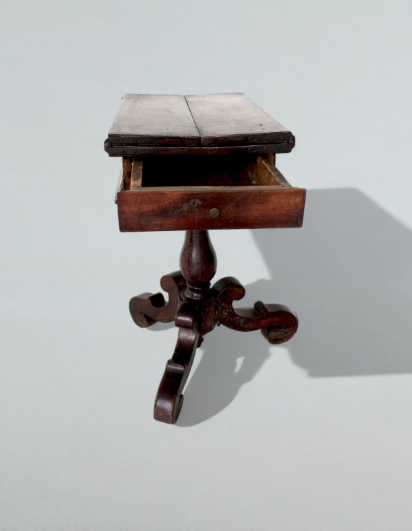 piano da aprirsi a bandelle, un cassettino, fusto a balaustro su tre gambe a voluta