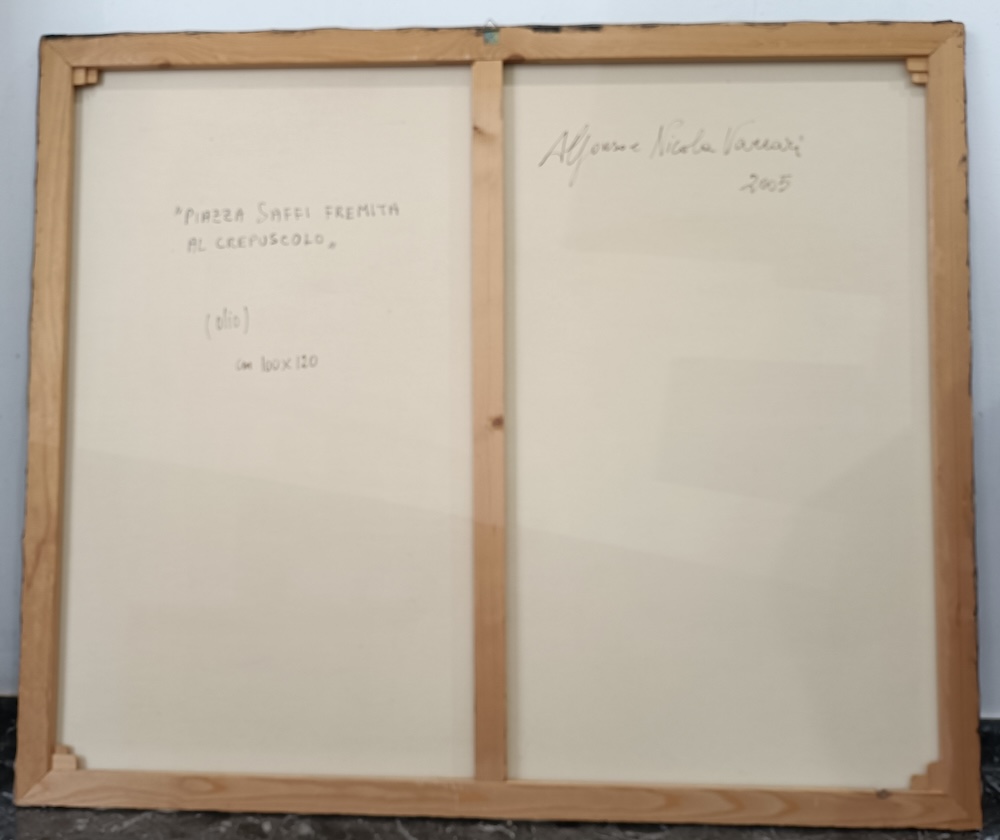Alfonso Nicola Vaccari (Forlì 1961). Piazza Saffi fremita al crepuscolo, 2005. Olio su tela. Titolato, dimensione e tecnica al verso. Al verso firmato e datato Alfonso Nicola Vaccari 2005. Cm. 100x120.