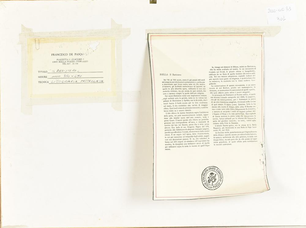 Francesco De Pasquale IL BATTISTERO litografia pastellata su carta, cm 35x49;...