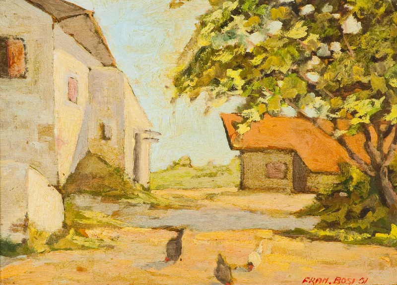 Francesco Bosi SULL'AIA, 1951 Olio su tavola, cm. 29x40 Firma e data in basso a destra. Sul verso: titolo.
