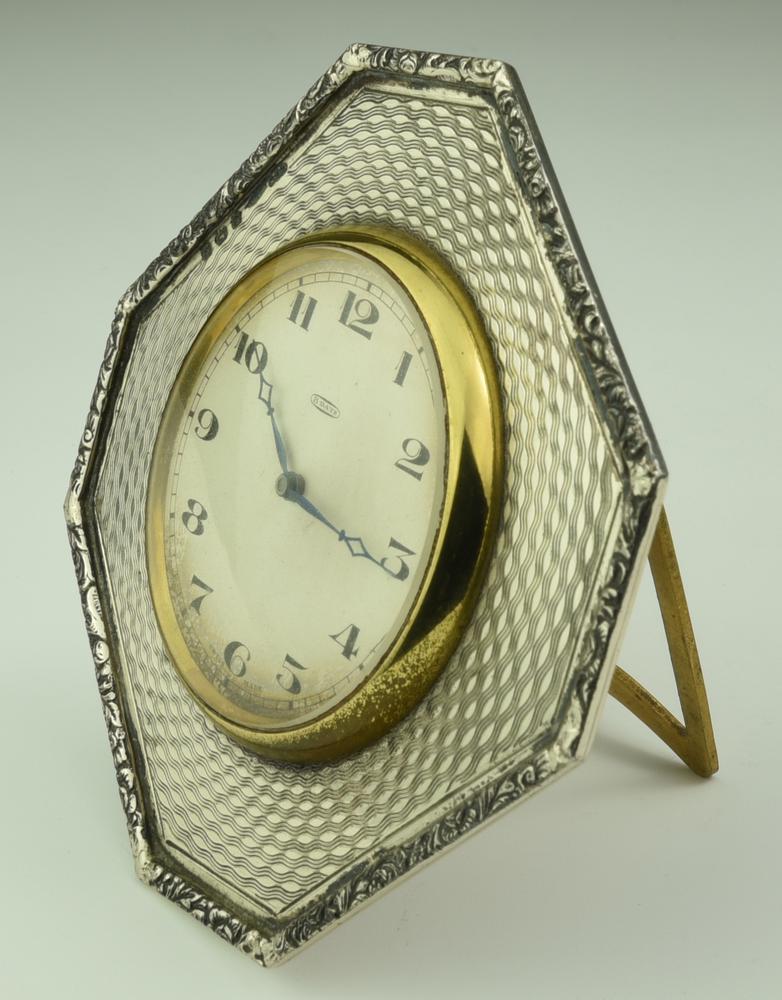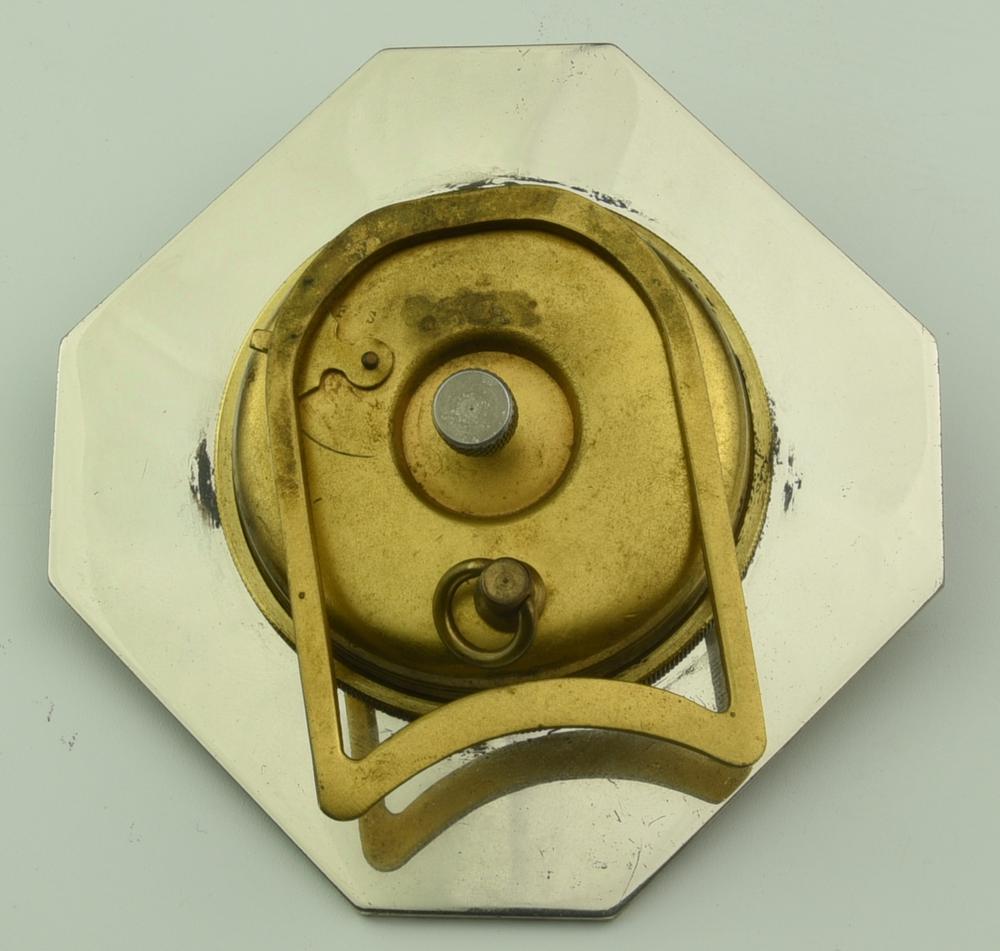 PICCOLA SVEGLIA DA VIAGGIO in ottone e argento con decorazione incisa;...