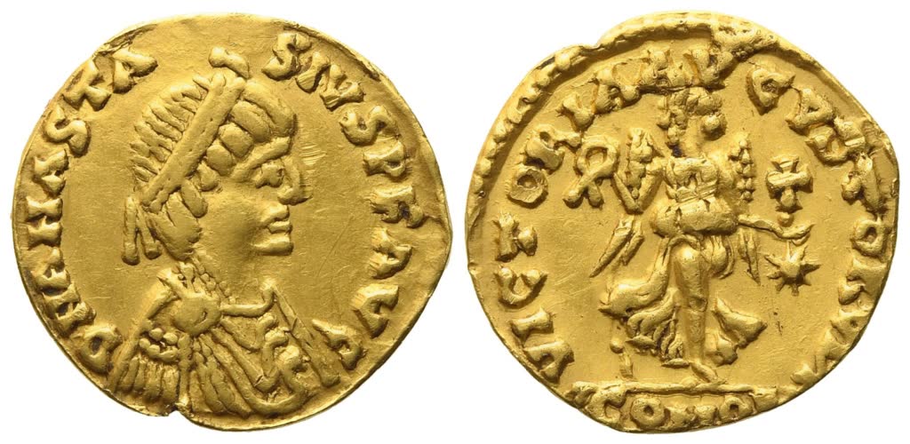 DN ANASTA - SIVS PF AVG, diademed, draped and cuirassed bust r., Rv. VICTORIA AVGVSTORVM, Victory advancing r., head l., holding wreath and glober cruciger at r., star in ex., CONOB; DOC 10; Sear 8. Good very fine / near extremely fine.