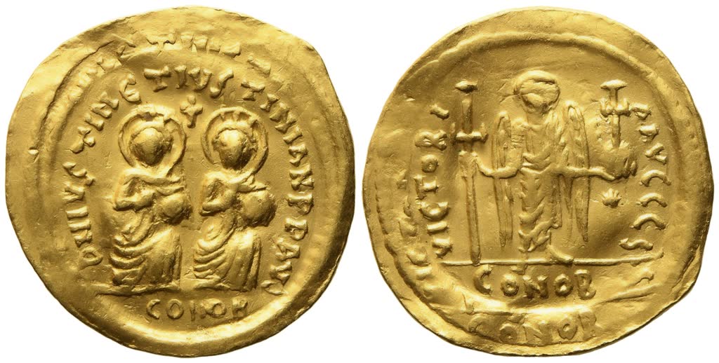 DN IVSTIN ET IVSTINIAN PP AVG, Justin and Justinian enthroned facing, both nimbate and holding globus; cross above, CONOB below; Rv. VICTORIA AVGGG S, angel standing facing, holding long cross and globus cruciger; star in r. field; CONOB in exergue. DOC I 5c; Metcalf, Joint 16 (O6/S4); MIB I 1d; Sear 120. Double struck, both on obverse and reverse. Flan slightly bent, otherwise near extremely fine.
