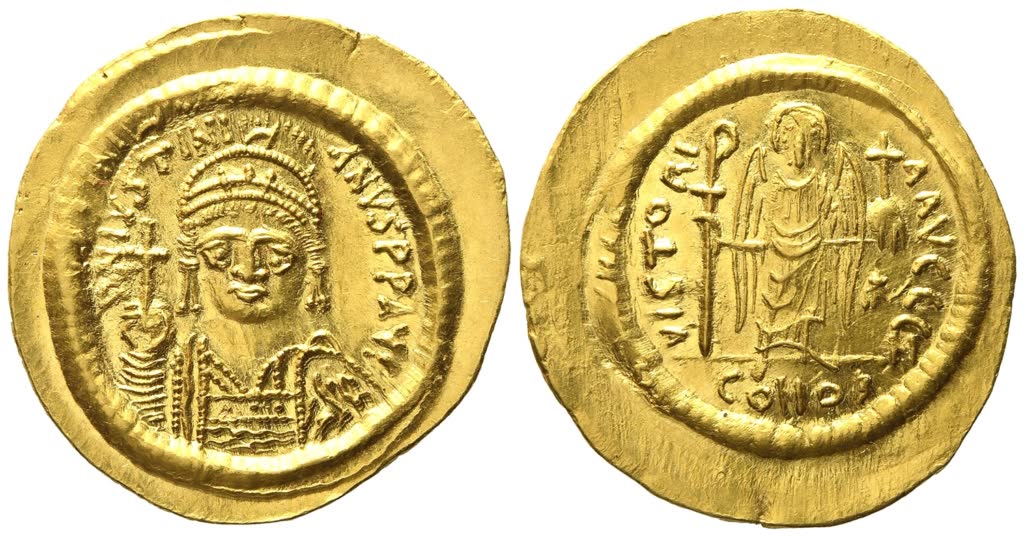 Constantinople, struck circa 542-565. D N IVSTINI-ANVS P P AVG, helmeted and cuirassed bust facing, shield with horseman device on left shoulder, globus cruciger in right hand; RV. VICTORIA AVGGG, angel standing facing, holding long cross in right hand, globus cruciger in left hand; officina Z, star in right field, CONOB in exergue. Sear 139; DOC 6. Good extremely fine.