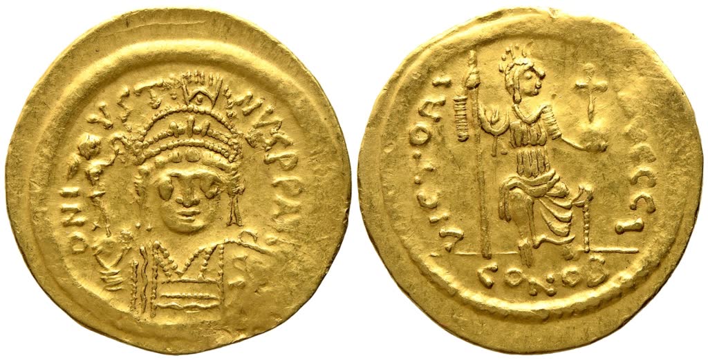 D N IVSTINVS P P AVG, helmeted and cuirassed bust facing, holding shield and globus surmounted by crowning Victory; Rv. VICTORIA AVGGG I / CONOB, Constantinopolis seated facing on throne, head r., holding sceptre and globus cruciger. Sear 345. Good very fine / near extremely fine.