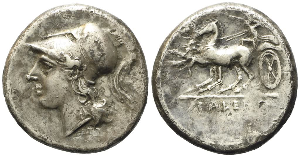 Head of Athena l., wearing crested Italo-Corinthian helmet; Rv. Nike in car of biga racing l., holding reins and goad, CALENO in exergue. HN Italy 434; SNG ANS 171. Very fine.