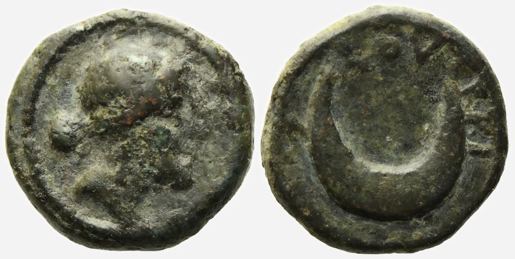Head of Artemis to r.; Rv. Crescent; LOVCERI above. HN Italy 683; HGC 1, 612. Green patina. Very fine.
