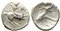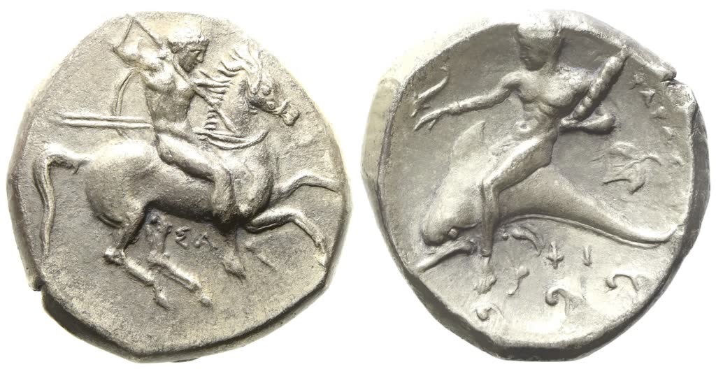 Phili- and Phi-, magistrates. Nude rider on horse galloping to r., stabbing with spear held in his r. hand and holding two other spears and shield with his l.; below, ΣΑ; Rv. TAPAΣ, Youthful oikist, nude, riding dolphin to l., holding dolphin in his r. hand and distaff in his l.; to left, ΦΙ; to right, ivy-leaf; below, waves. HN Italy 934; Vlasto 584. Extremely fine.