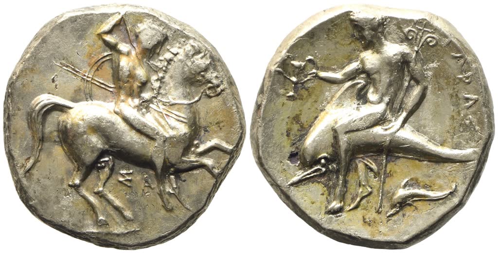 Warrior, preparing to cast spear held in r. hand, holding two spears and shield in l., on horse rearing r., ΣΑ below; Rv. Taras, holding kantharos in extended r. hand, cradling trident in l. arm, astride dolphin l.; below, small dolphin l.. HN Italy 937; SNG ANS 995 var. Near extremely fine.