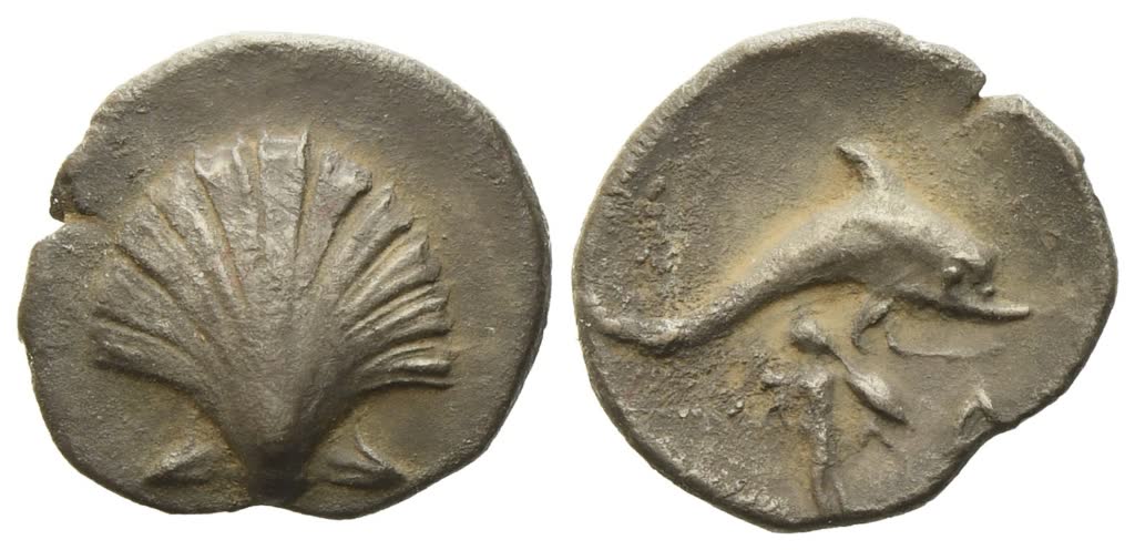 Scallop shell; Rv. Dolphin r.; below, Athena Promachos standing l., brandishing spear and holding shield on her left arm; Δ in r. field. HN Italy 979; Vlasto 1501. Good extremely fine. Fine style.