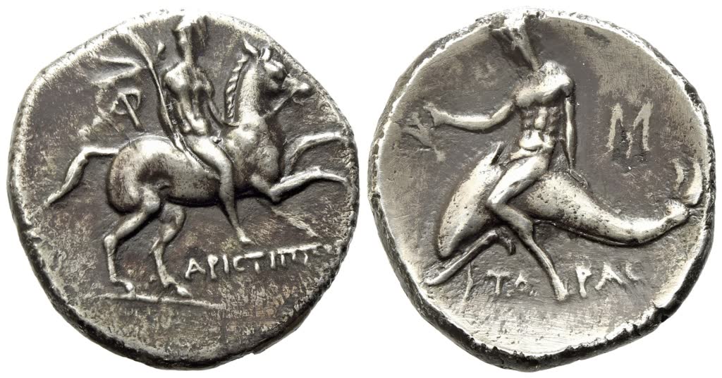 ΑΡΙΣΤΙΠΠΟΣ (Aristippos), AP- (Ar-), MY- (My-), magistrates. Nude rider on horse prancing r., carrying palm-branch tied with fillet, monogram AP to left, APICTIΠΠOC below; Taras astride dolphin to l., holding kantharos with r. hand, and resting left hand on dolphin’s back, monogram MY to r., TA-PAC below. Vlasto 947-8; HN Italy 1056. Good extremely fine / extremely fine.