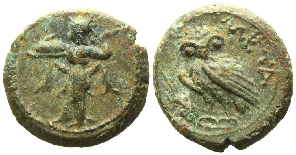 Athena Promachos advancing to left, carrying shield and brandishing spear; Rv. Owl standing to left, wings closed and head facing, on stalk of barley; META downwards behind. Johnston, Bronze 68c; HN Italy 1704; HGC 1, 1113. Green patina with brownish hues. Good extremely fine.